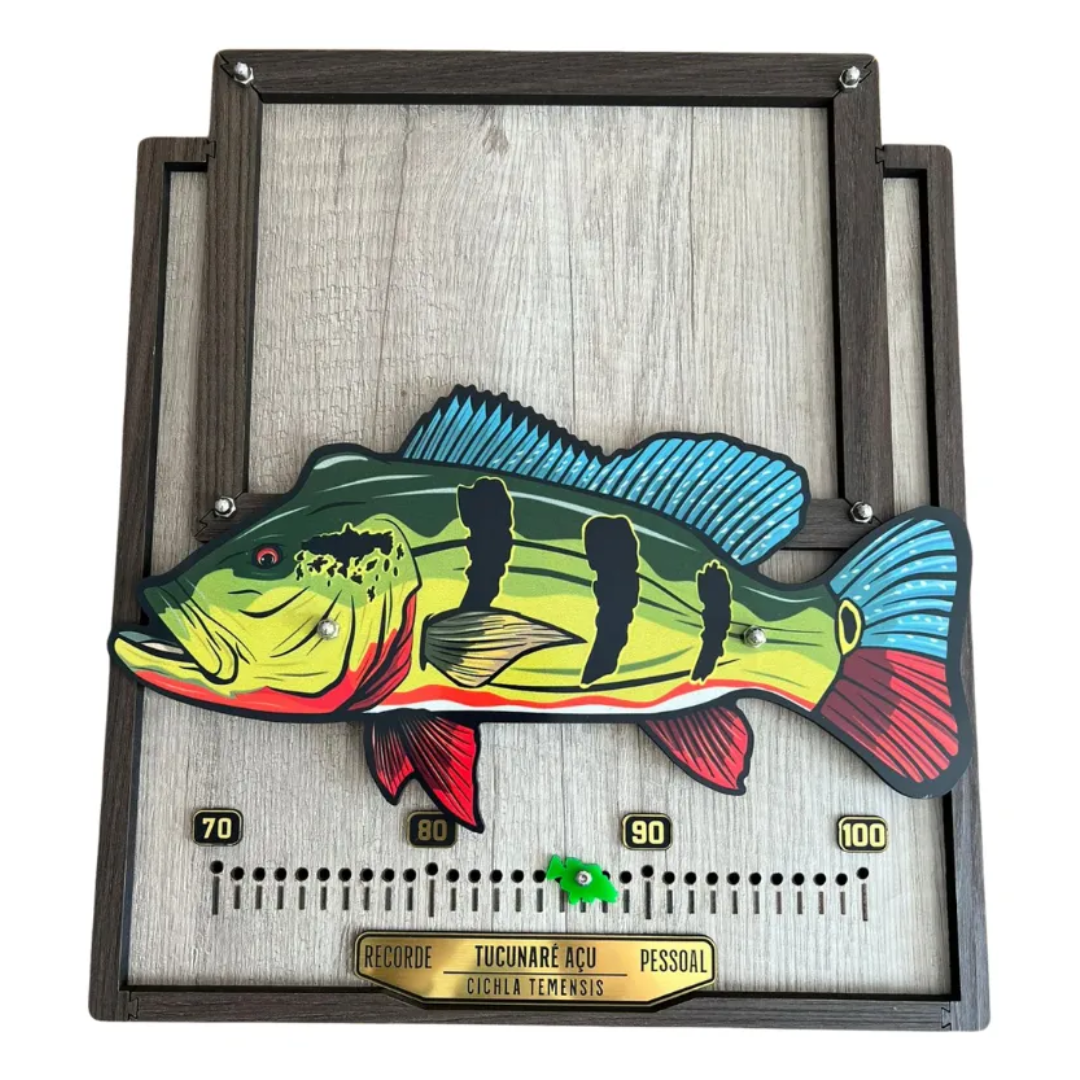 O destaque do quadro é a régua integrada, onde o recorde da captura é marcado apenas em centímetros (cm), permitindo registrar visualmente o tamanho do peixe de forma simples e objetiva.